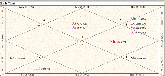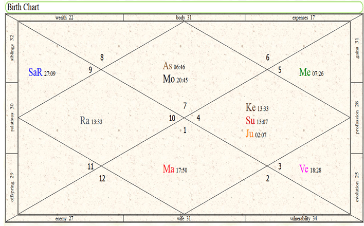 This horoscope is of a male from New Delhi, India and migrated to Canada in 2015 in the dasha of Saturn Venus.
