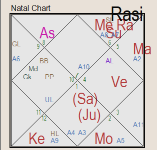 During personal interactions, he shared charts of other Jain monks for analysis and eventually revealed his own horoscope. Although the exact birth time is no longer available, two combinations stood out clearly and he pointed these to me. Mercury Sun Rahu combination in the twelfth house. Mercury is the exalted twelfth and ninth lord and is in the twelfth house. There is also an exchange between 12 and 8th lords with both being benefic.